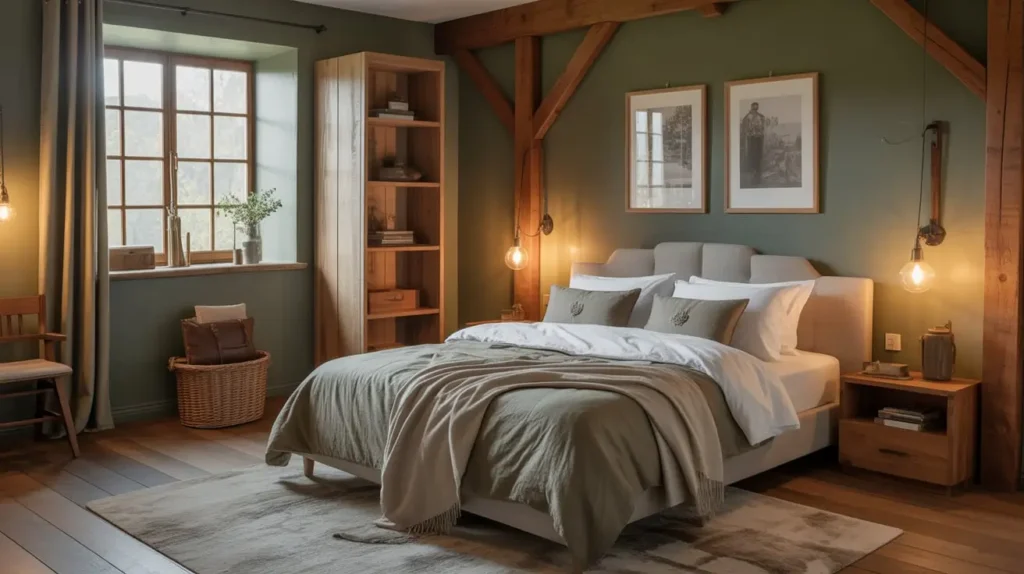 Now, if minimalism feels too cold for your taste, let’s talk rustic charm. A rustic green and gray bedroom wraps you in warmth like a thick wool blanket on a chilly morning.