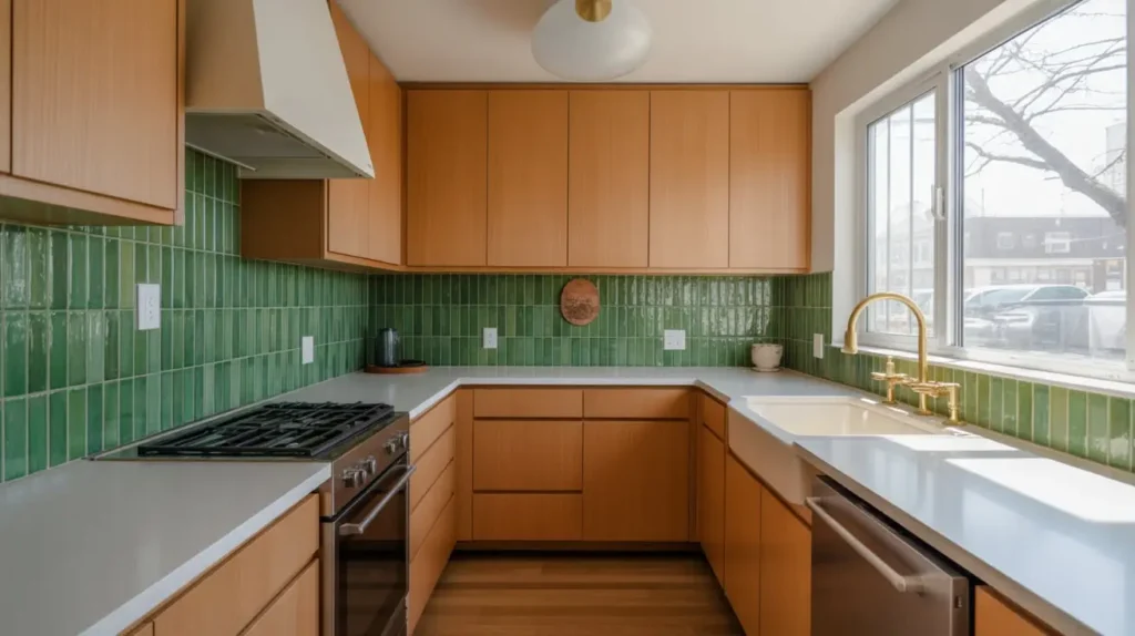 9. Green Tile Backsplash with Warm Wood Cabinets