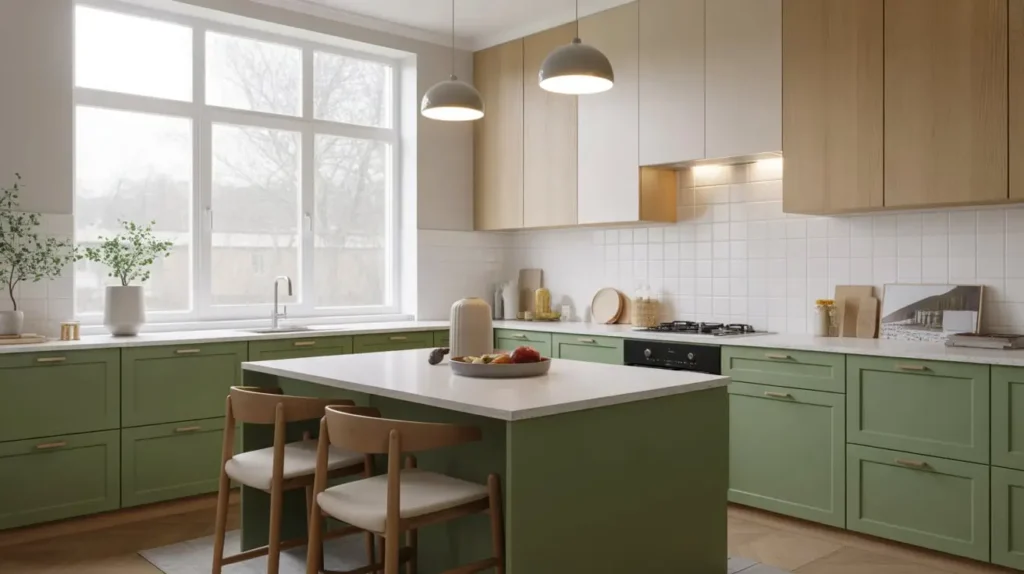 - Countertop as a Divider: The countertop acts as the dividing line. A bright white or very light grey quartz creates a crisp, clean break between the green and the wood.