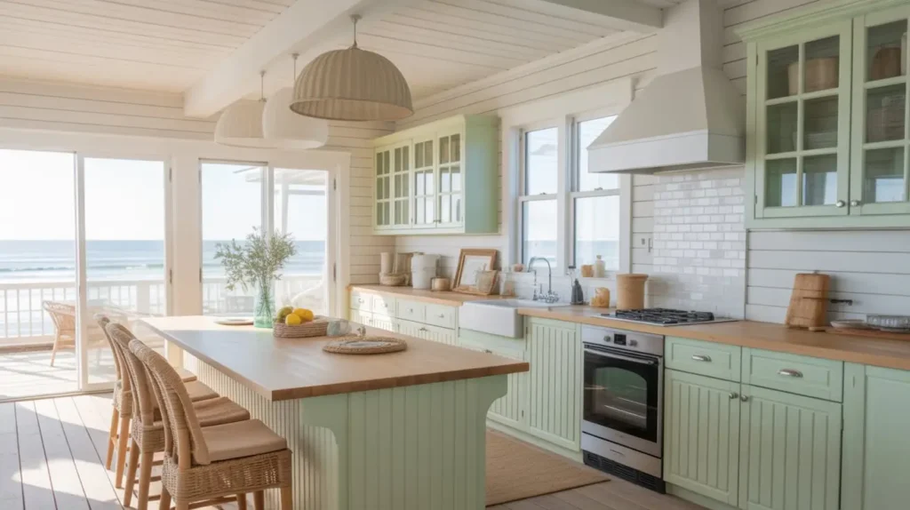 Last but not least, let’s head to the beach. This isn’t your kitschy, seashell-covered coastal, but a more sophisticated, modern interpretation. It uses soft sea-inspired greens and weathered, driftwood-toned woods to create a relaxed, breezy, and elegant space.