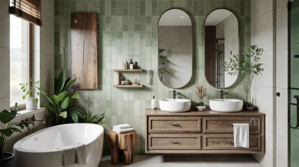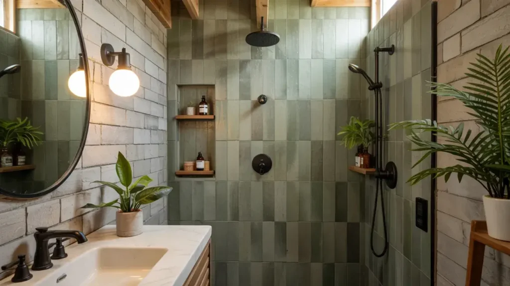 Natural stone tiles in earthy green tones bring this organic, grounded quality that connects your bathroom to nature. We’re talking slate, travertine, or natural stone with green mineral deposits. Each tile has unique variations, creating a one-of-a-kind installation that mass-produced tiles can’t replicate.