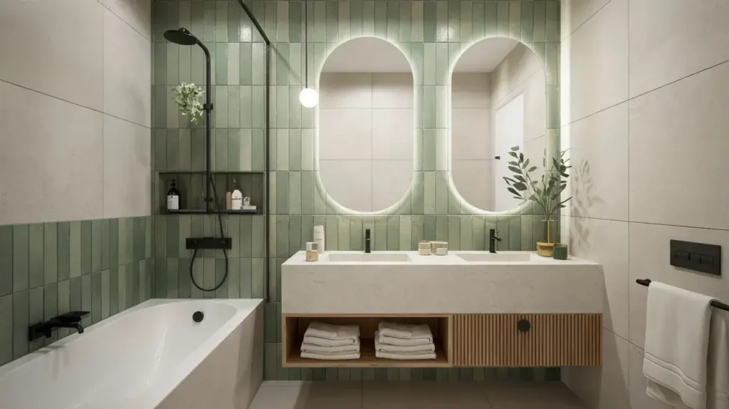 Large-format tiles (we’re talking 12×24 inches or bigger) create this sleek, contemporary look with minimal grout lines. In matte green, they bring sophisticated, understated luxury that feels very now. The matte finish is forgiving with water spots and has this soft, velvety appearance that I absolutely love.