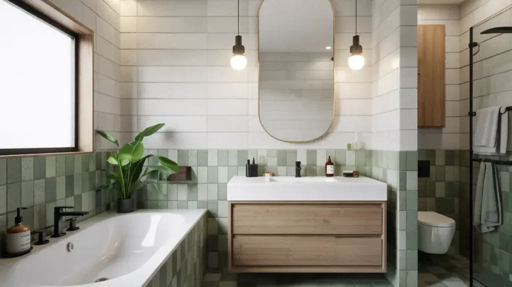 - Green wainscoting: Tile the lower third in green, upper walls in white