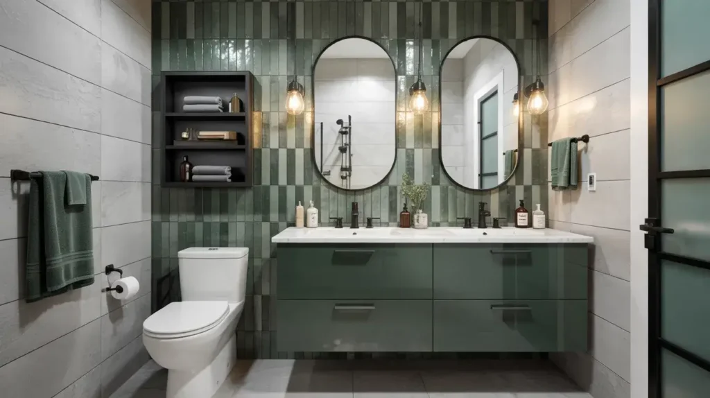 This design strategy works brilliantly in smaller bathrooms where floor-to-ceiling green might feel overwhelming. The white breaks up the color and adds brightness, making the space feel larger and more open.