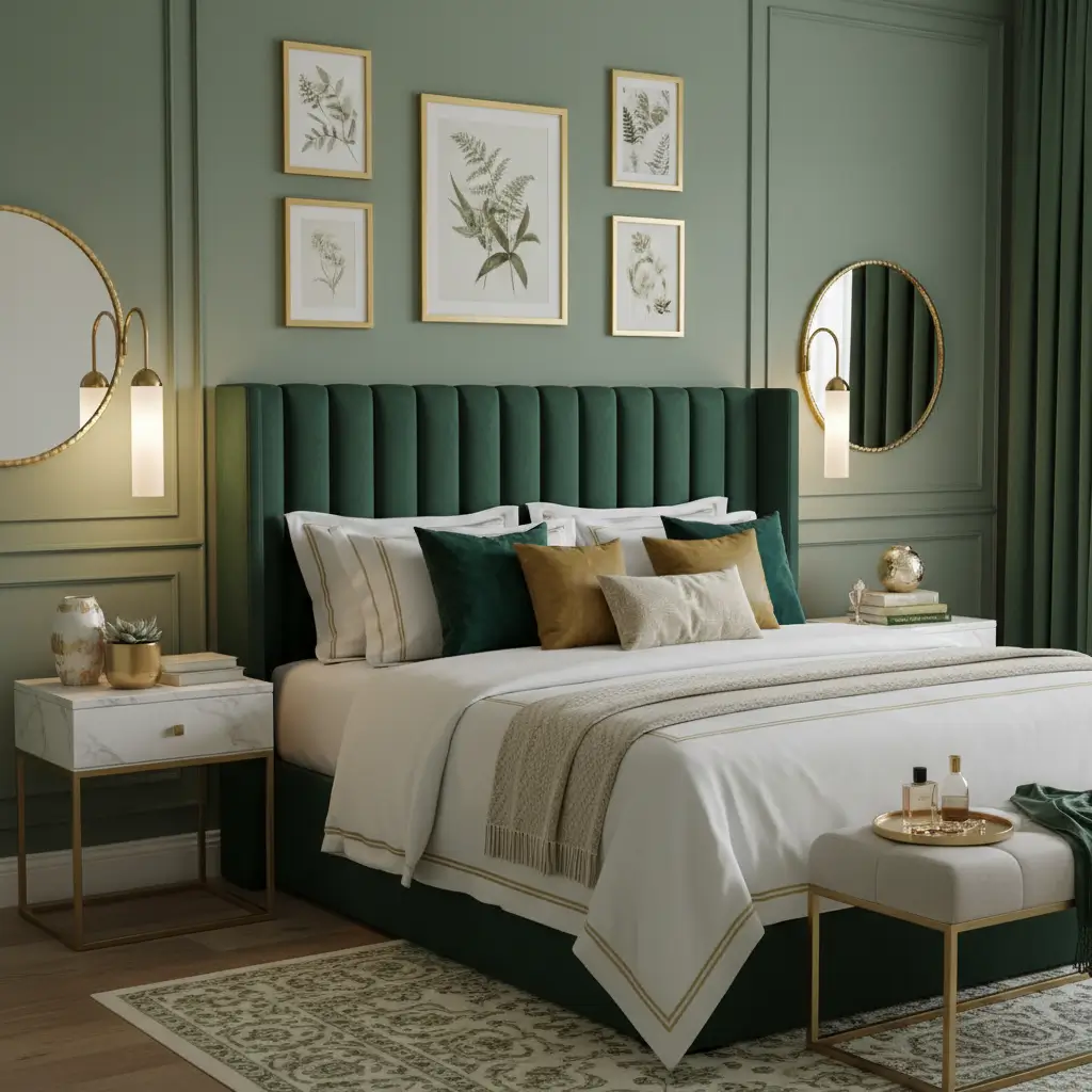 Think gold-framed mirrors, brass table lamps, gold-finished drawer pulls, and maybe some gold-threaded throw pillows. Keep your green in a sophisticated shade—sage, emerald, or deep forest work beautifully. Avoid lime green unless you want your bedroom to look like a 1970s disco (and hey, maybe you do—no judgment :).