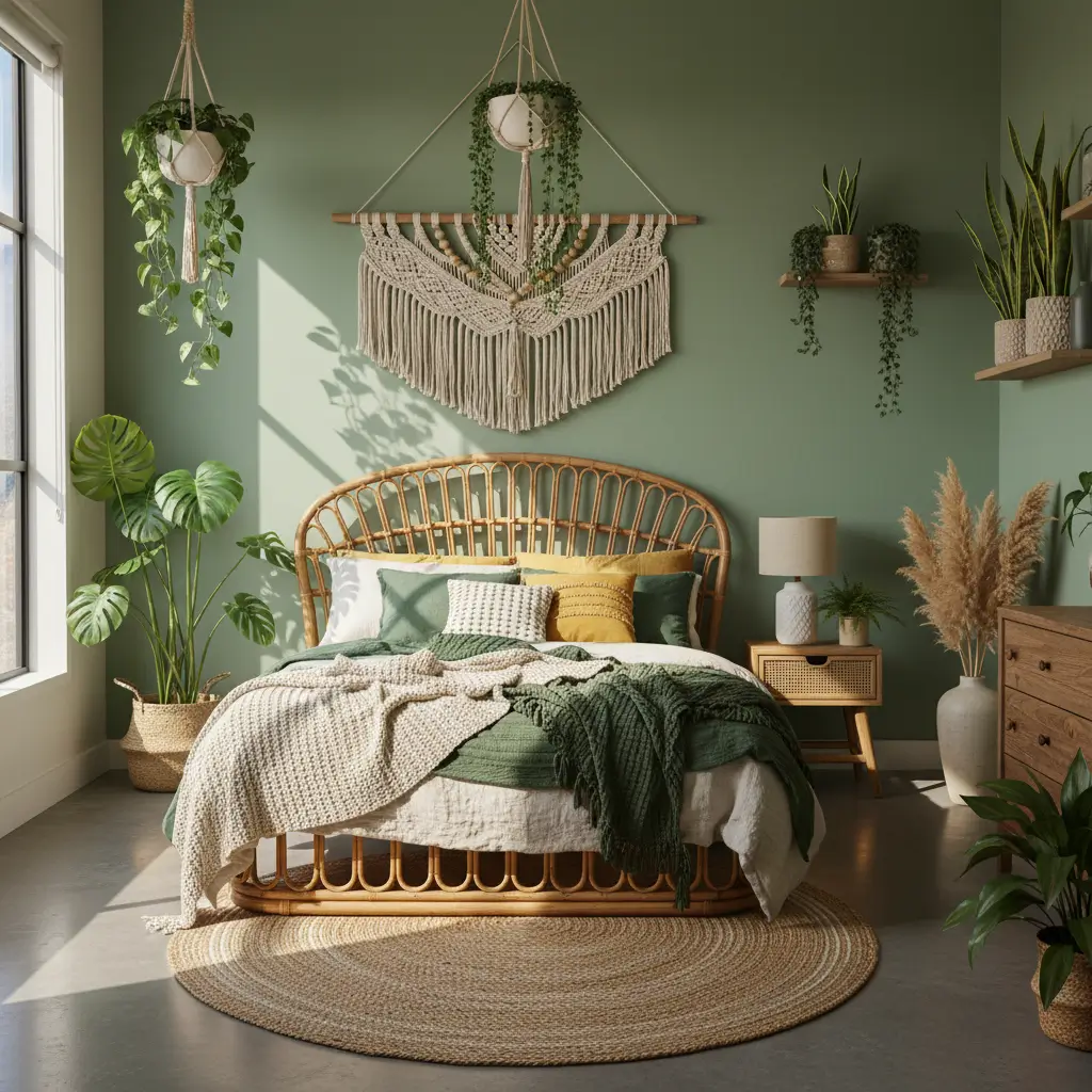 7. Boho Green Bedroom with Plants