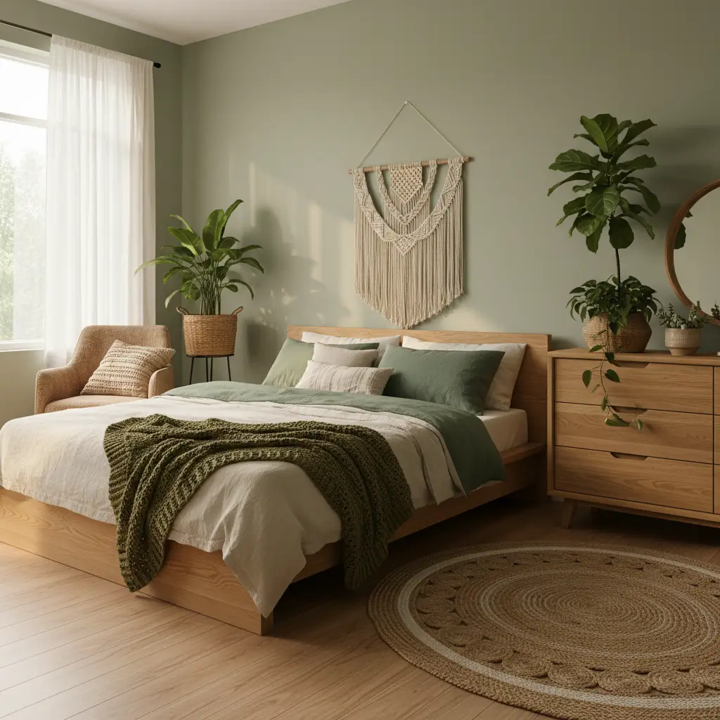 10. Green Bedroom with Natural Wood Decor