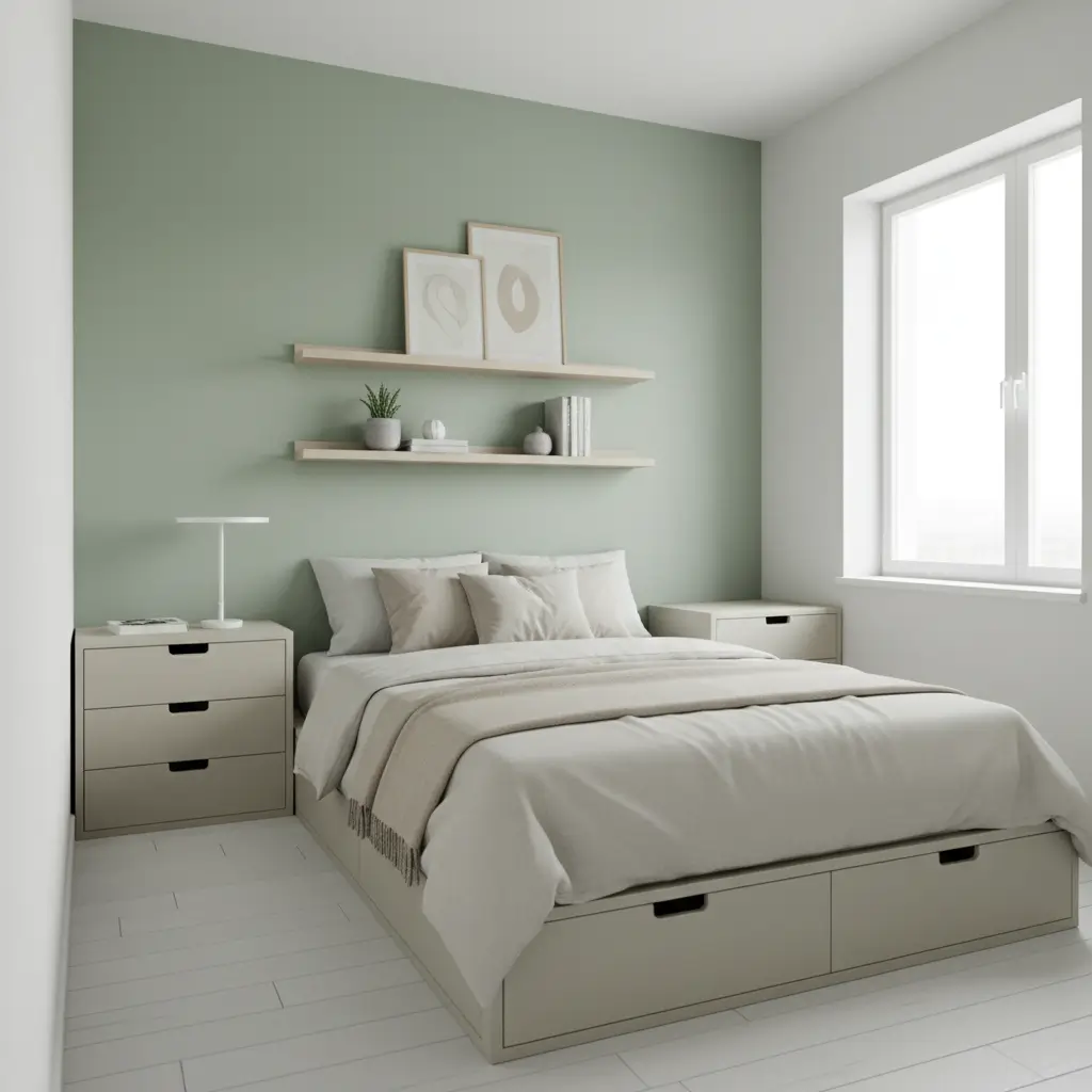 Paint your walls a soft green and keep your furniture low-profile. A platform bed with storage underneath, floating nightstands, and wall-mounted lighting free up precious floor space while maintaining that elegant green aesthetic.