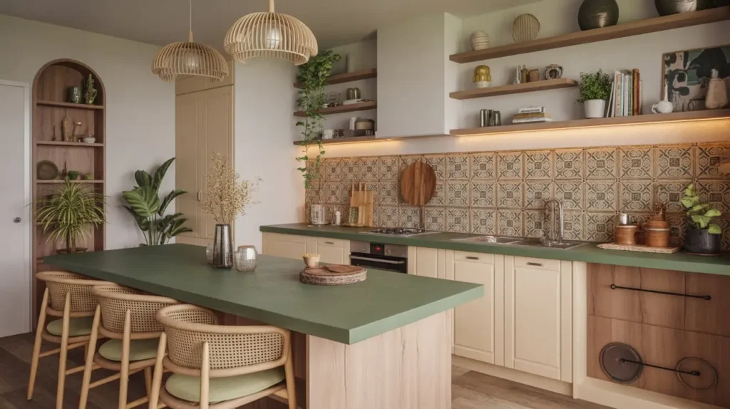 Boho style is all about mixing patterns, textures, and colors in a way that feels effortlessly eclectic. Green countertops fit perfectly into this aesthetic, especially when you play with unexpected color combinations.