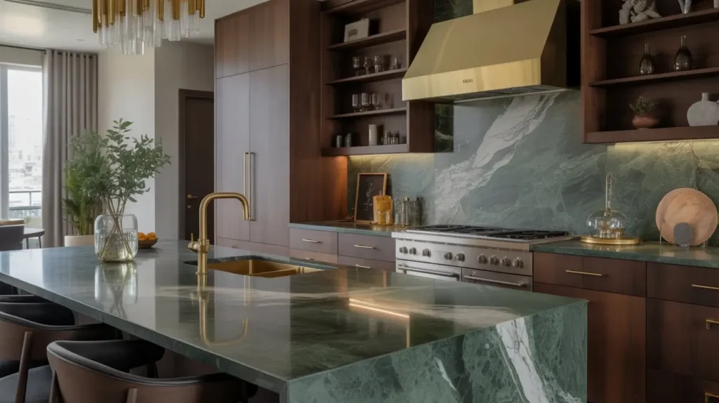 Forest green marble isn’t for the faint of heart. It’s bold, it’s unapologetic, and it absolutely demands attention. I’ve seen it work gorgeously in kitchens with gold or brass accents, dark wood cabinetry, and even all-white cabinets when you want the countertop to be the star of the show.