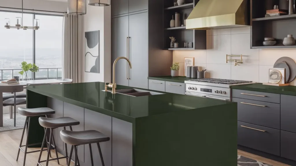 Dark green quartz countertops are for people who want to make a statement. This isn’t subtle. This isn’t background. This is bold, dramatic, and absolutely gorgeous when styled correctly.