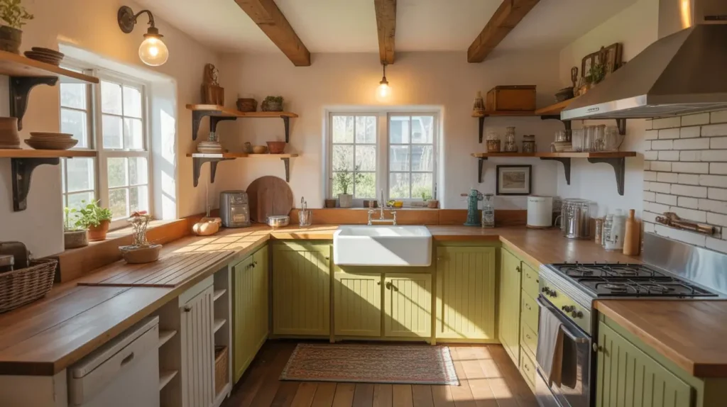 What really sells this look is layering textures. Smooth olive counters, rough wood beams, soft linen curtains, and metal accents create visual interest that keeps the space from feeling flat or boring. Farmhouse done right feels collected over time, not bought all at once from the same store (even if it was).