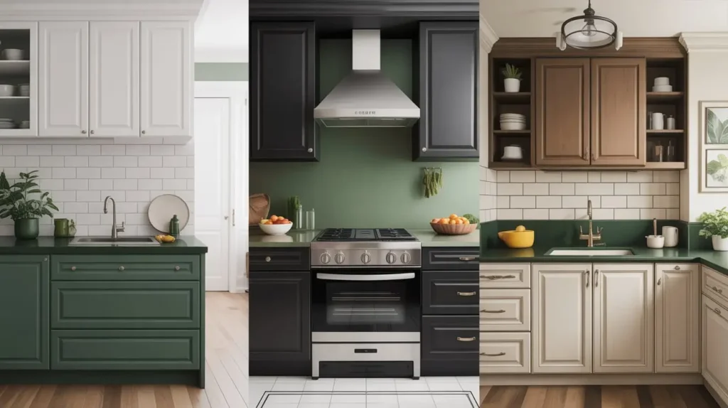 Gray cabinets offer a modern, neutral backdrop. Warm grays work better than cool grays with most green tones—they feel harmonious rather than cold. And here’s a bold move: green cabinets with green counters in different shades creates a monochromatic look that’s unexpectedly chic.