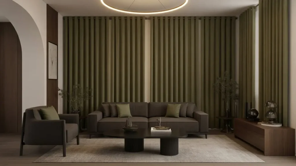 When used for curtains in a modern living room, moss green acts as a sophisticated anchor. It provides a touch of nature and organic color that can soften the hard lines of contemporary furniture. It’s a grown-up green that feels both timeless and completely on-trend.