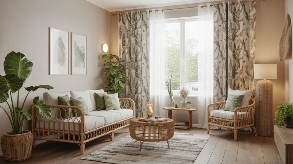 - Natural Companions: Pair it with other natural materials: a jute rug, rattan furniture, wooden bead garlands, and lots of cozy, patterned textiles on the sofa.