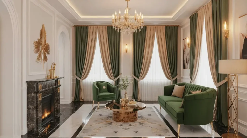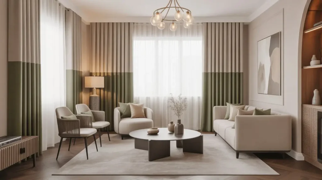 This is one of my favorite tricks for creating a custom, high-end look on a budget. Using two-tone curtains—specifically a combination of green and a neutral like beige or cream—adds instant architectural interest and sophistication.