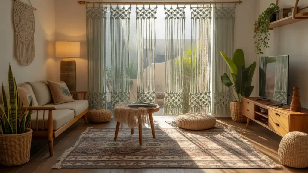 This style is all about texture, craftsmanship, and a laid-back, eclectic vibe. It doesn’t block much light and offers minimal privacy, so it’s more about framing a view and adding a massive dose of personality. It’s perfect for a living room that’s a collection of plants, vintage finds, and comfy, low-slung furniture.
