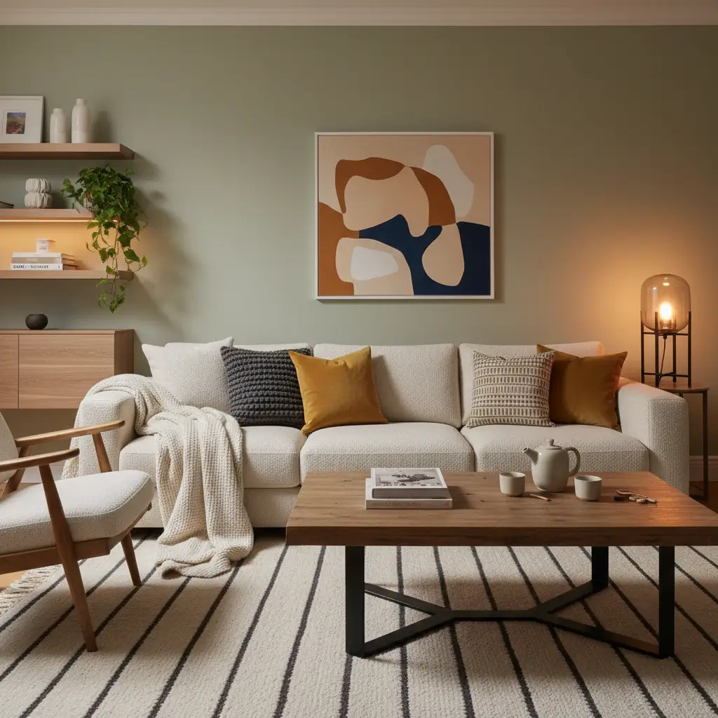 The contemporary framework uses neutral bases with pops of current trendy colors. Right now, that might be terracotta, sage green, or dusty pink. But you layer in chunky knit throws, plush area rugs, and plenty of cushions to create that “ahh, I’m home” feeling.