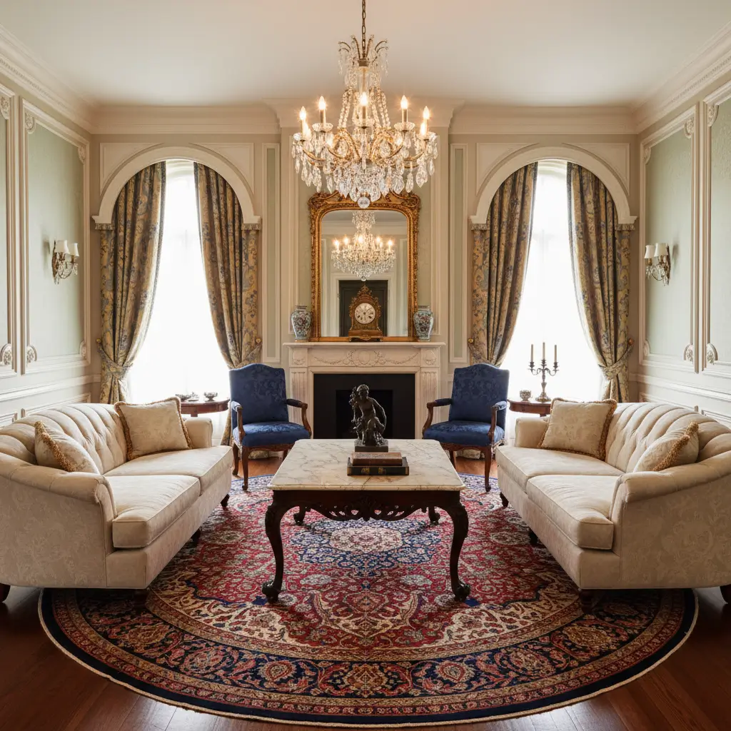 This style draws from Georgian, Victorian, and other historical periods, featuring symmetrical arrangements, rich wood tones, and ornate details. Crown molding, coffered ceilings, traditional furniture with carved details—we’re channeling old-world sophistication here.