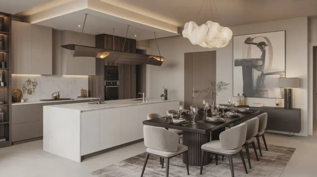 - Simple, Sculptural Lighting: A single, striking pendant light over the dining table or a sleek track lighting system is all you need.