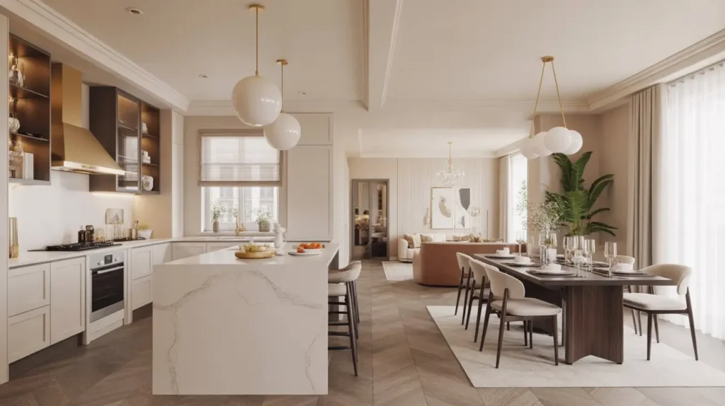 - Lighting as a Divider: Use different types of lighting. Task lighting (like under-cabinet lights) in the kitchen, and a dramatic chandelier or pendant over the dining table. This helps signal the different functions of each area.
