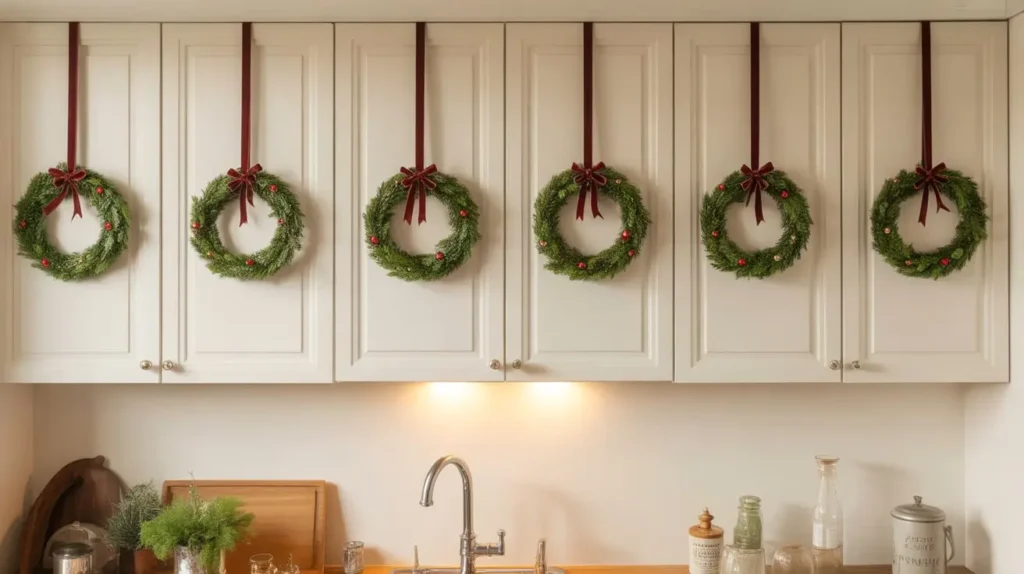Sometimes the best ideas are the simplest ones. Mini wreaths hung on cabinet doors hit that sweet spot between festive and functional.