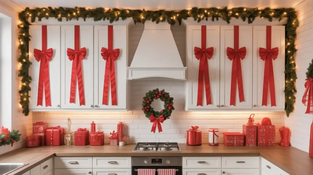 Threading wide red ribbons through your cabinet handles and tying them in bows instantly transforms your entire kitchen. It takes maybe 20 minutes and costs about $15 if you shop smart.