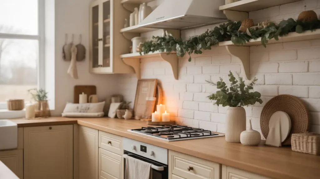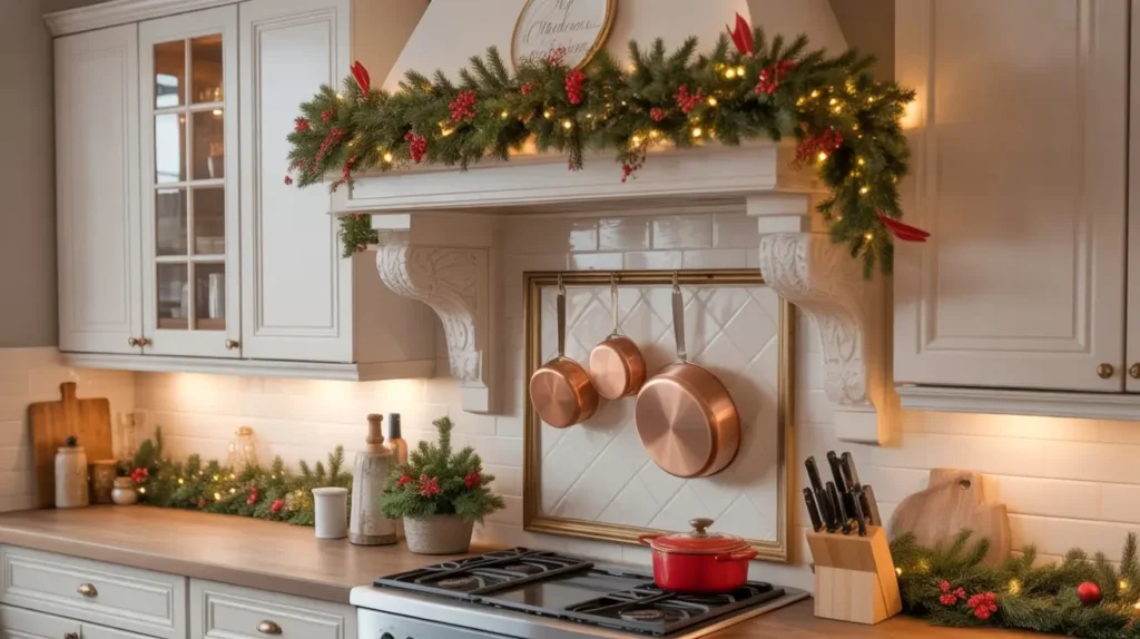 Draping garland across your range hood or along the wall beside your stove creates a dramatic focal point that frames your cooking area beautifully.
