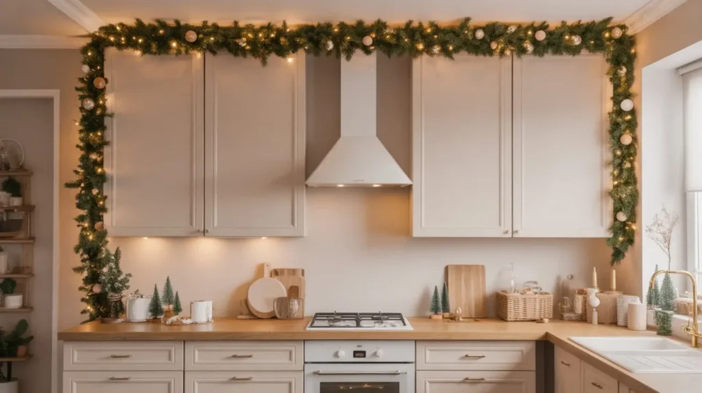 Draping garland along the top of your cabinets adds a festive touch to often-wasted space and draws the eye upward, making your kitchen feel larger and more decorated without cluttering counter space.