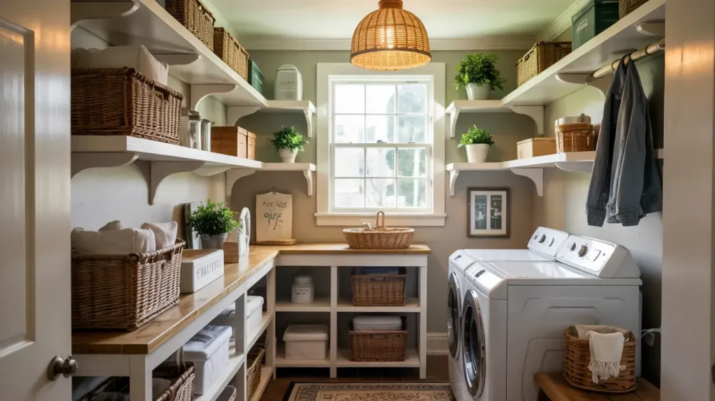 Open shelving in laundry rooms serves both functional and aesthetic purposes. You can grab what you need instantly, and when styled well, it creates visual interest. When styled poorly… well, it looks like a cluttered mess.