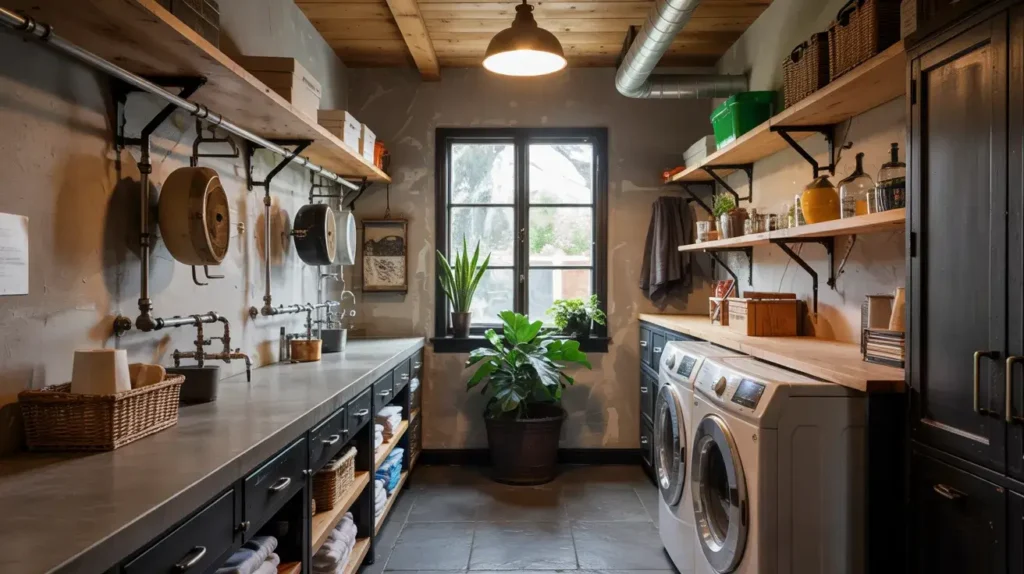Industrial style laundry rooms embrace materials like concrete, metal, and reclaimed wood. I’ve seen conversions of old factory spaces that kept the original brick walls and metal pipes, and they’re absolutely stunning. You can recreate this aesthetic even in newer homes with the right design choices.