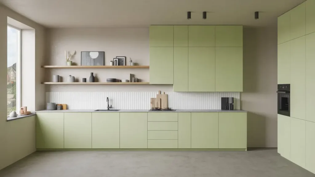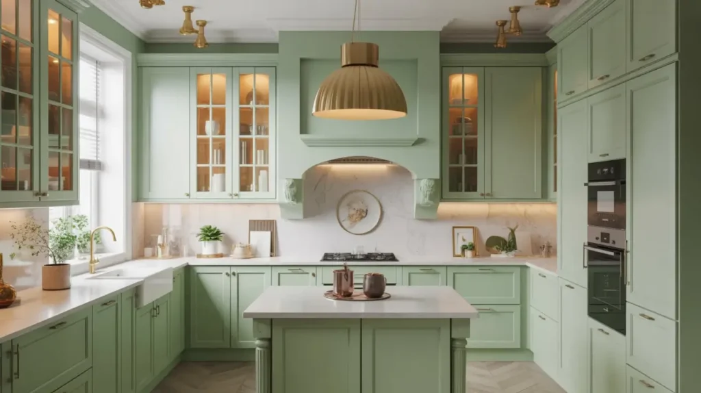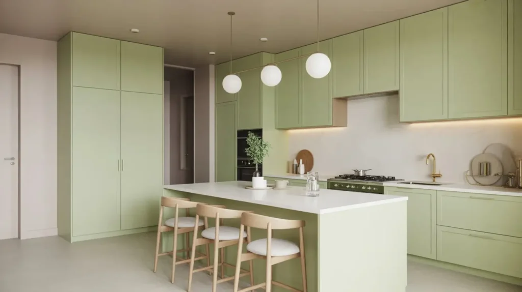 Pistachio green is slightly more saturated than some of the paler greens we’ve discussed, but it’s still soft and approachable. When you pair it with white quartz countertops, you create a clean, fresh look that feels both modern and timeless.