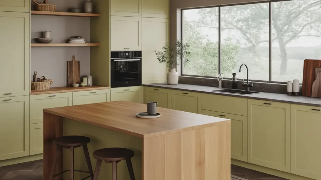 5. Light Olive and Natural Wood Kitchen