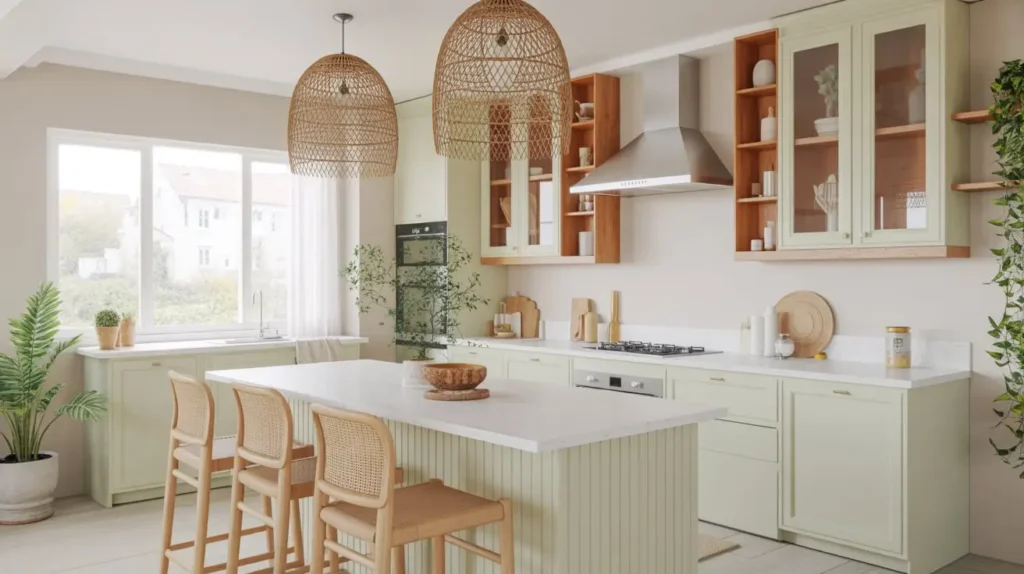 Let’s end with something really special. Sage mist is one of the most beautiful light green shades—it’s soft, complex, and changes with the light. When you combine it with woven textures, you create a kitchen that feels organic, tactile, and deeply calming.