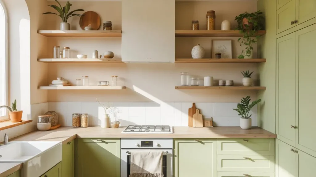 For this look, I’d go with painted cabinets in your soft green shade, paired with whitewashed wood elements. Maybe a reclaimed wood island or floating shelves made from weathered timber. Throw in some woven basketslinen curtains, and ceramic dishware, and you’ve got yourself a kitchen that feels like a seaside cottage.
