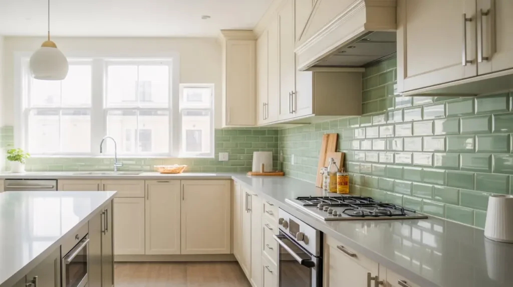 This works particularly well if you’re not ready to commit to green cabinets. You can keep your cabinets white, gray, or even wood-toned, and let the backsplash do the talking. It’s a lower-commitment way to introduce light green into your kitchen.