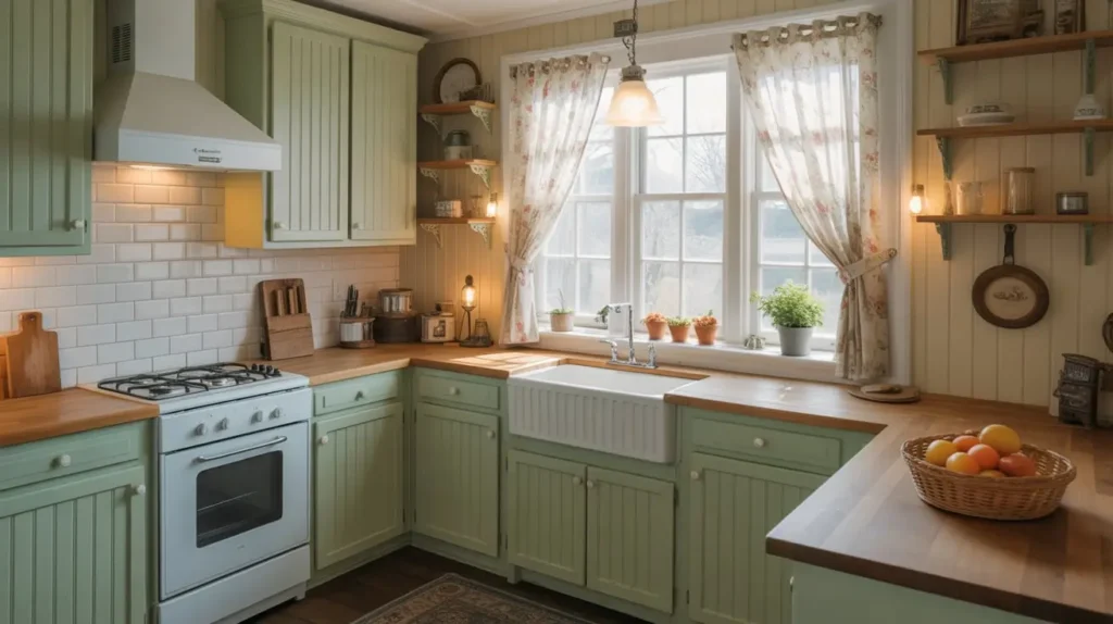 Your pale green cabinets should have a painted finish that looks hand-done, not factory-perfect. Some distressing at the edges? Even better. This style celebrates imperfection and character.