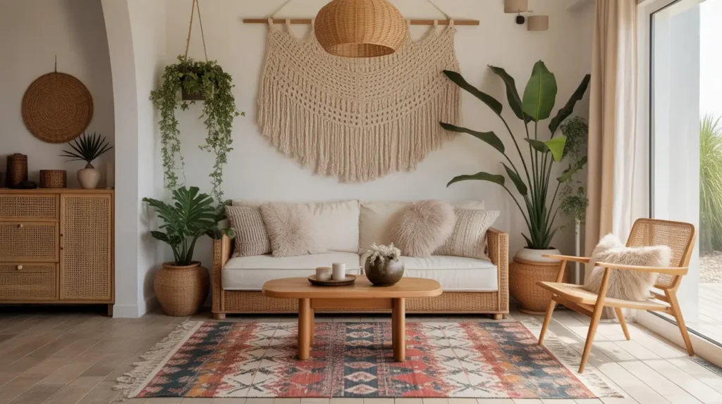 - Macramé wall hangings, woven baskets, and plants everywhere