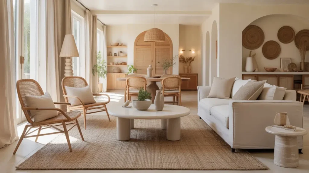 Boho design gives you permission to mix patterns, textures, and eras in a way that would make traditional designers twitch. But here’s the thing: it works, especially in combo spaces where you want the living and dining areas to feel connected but distinct.
