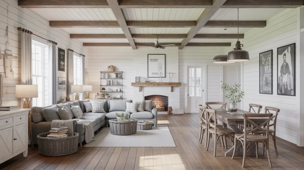 Modern farmhouse blends rustic charm with contemporary comfort, which gives you tons of flexibility. You can mix a reclaimed wood dining table with a modern sectional and somehow make it look intentional. It’s design magic, honestly.