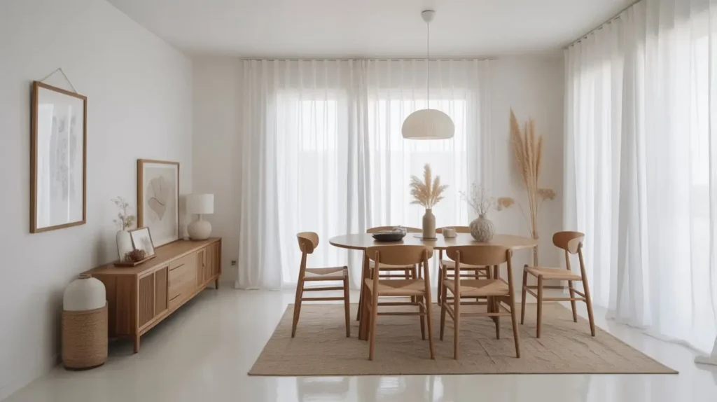 For furniture, think low-profile pieces with simple, elegant lines. A Japanese-style dining table in light wood, simple chairs (maybe with subtle cushions), and a streamlined sofa in the living area. Everything should feel intentional and uncluttered.