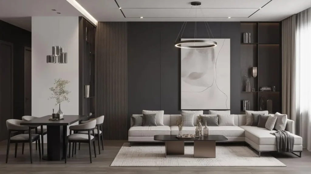 Lighting is huge here. Install statement pendant lights over the dining table and use recessed lighting or modern floor lamps in the living area. Contemporary design loves good lighting.