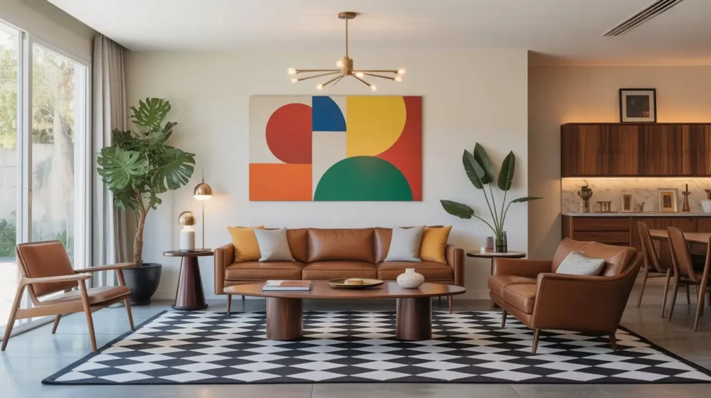 The color palette? You’ve got options. Go full retro with mustard yellows and burnt orange, or keep it modern with a more subdued palette of walnut wood tones, white, and black accents.