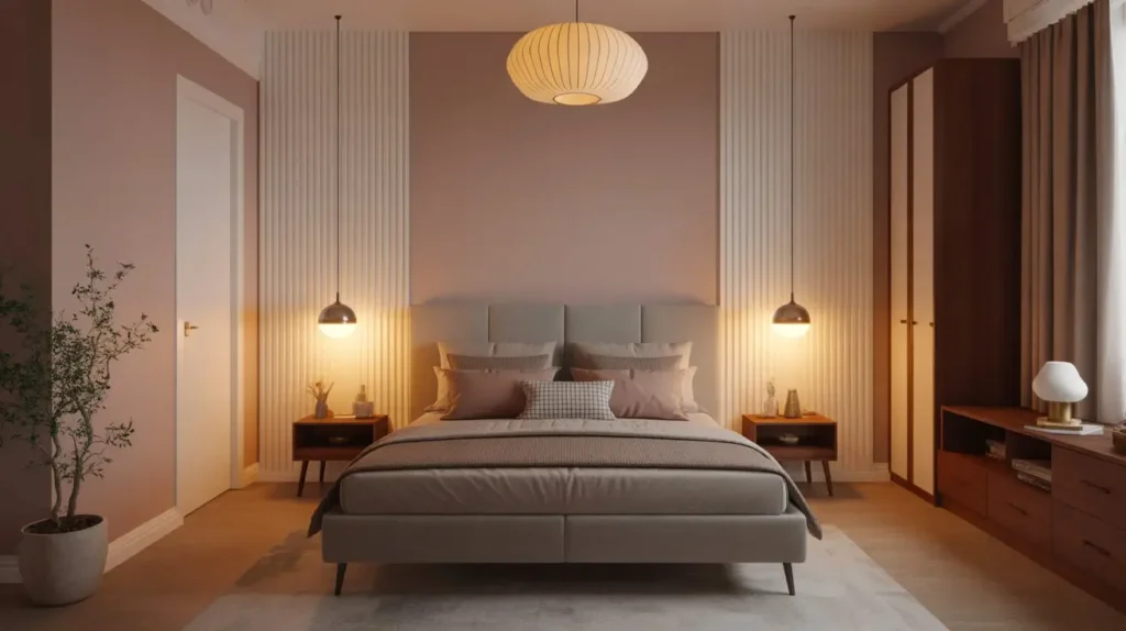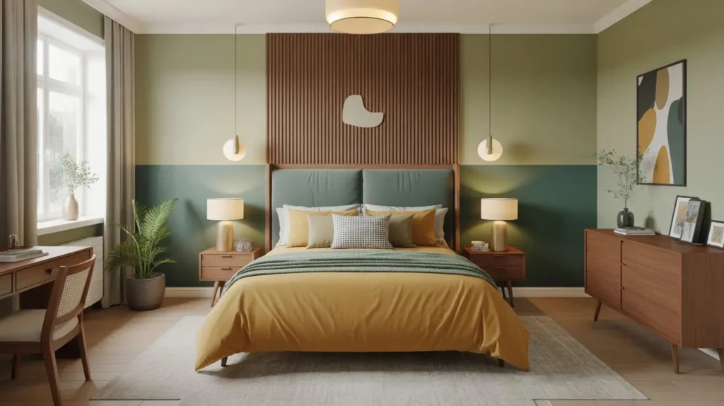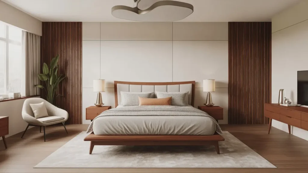 - Wall Paneling: A slat wood accent wall behind the bed adds texture and screams 1960s cool.