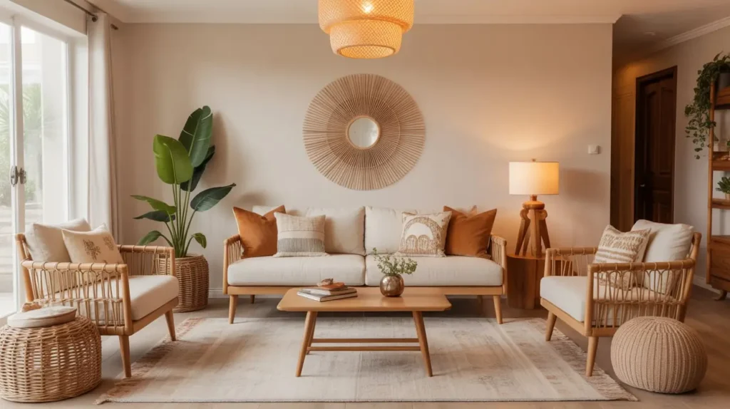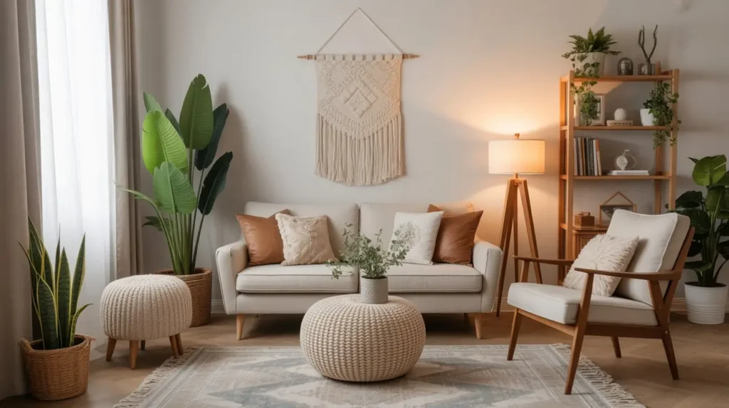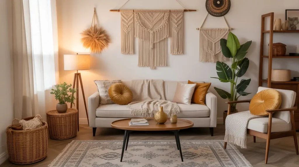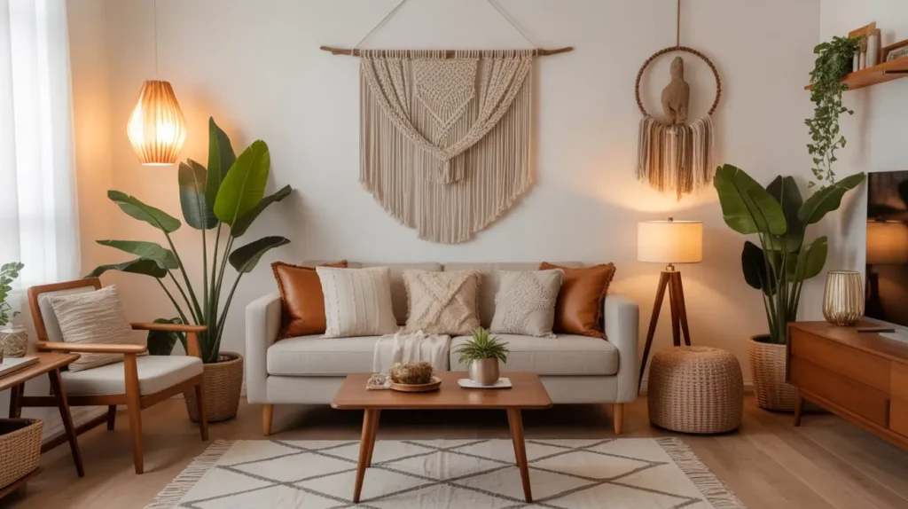 - 60% Dominant Color: This should be your Boho neutral. Think warm whites, soft beiges, or light grays for your walls and largest furniture pieces (like your sofa). This creates a calm, airy canvas.