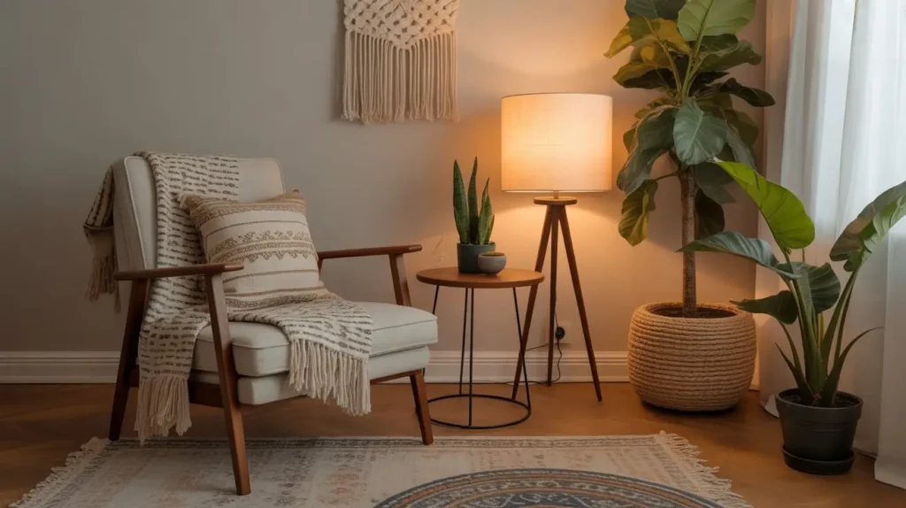 - The Light: It needs its own dedicated light source. A slim, brass floor lamp (MCM) or a small, woven pendant hanging from the ceiling (Boho) will create a warm, inviting glow.
