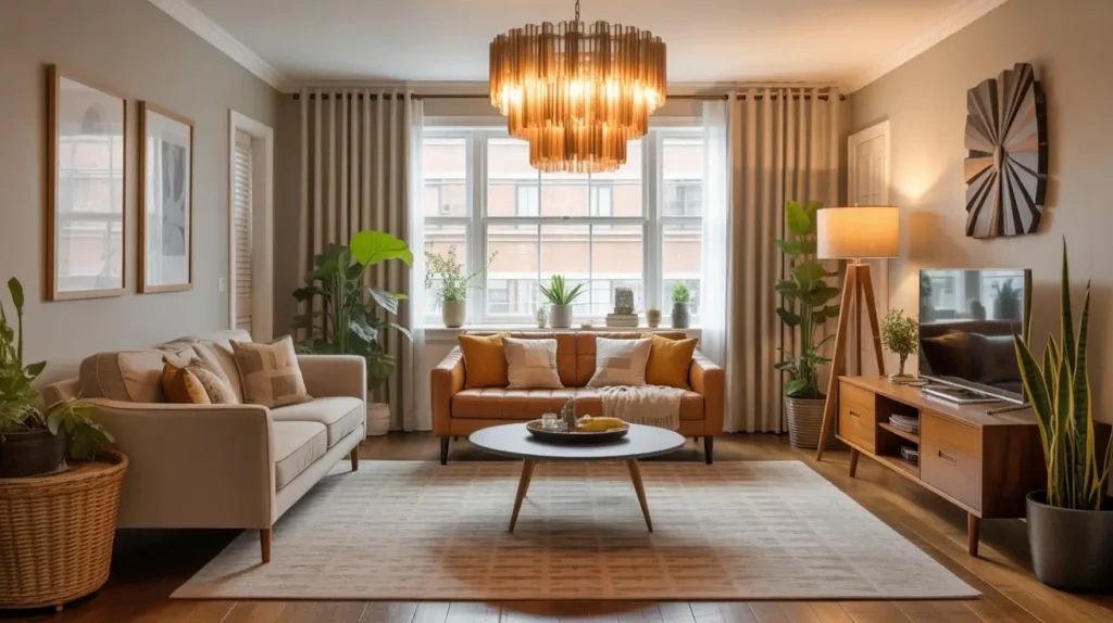 If you want the MCM aspect to be the star, invest in a Sputnik-style chandelier. Its explosive, geometric form is an instant focal point. Paired with softer Boho textiles and plants, it creates a stunning high-low contrast. Another great option is an Arco floor lamp, with its dramatic curve over the seating area. It’s functional art.