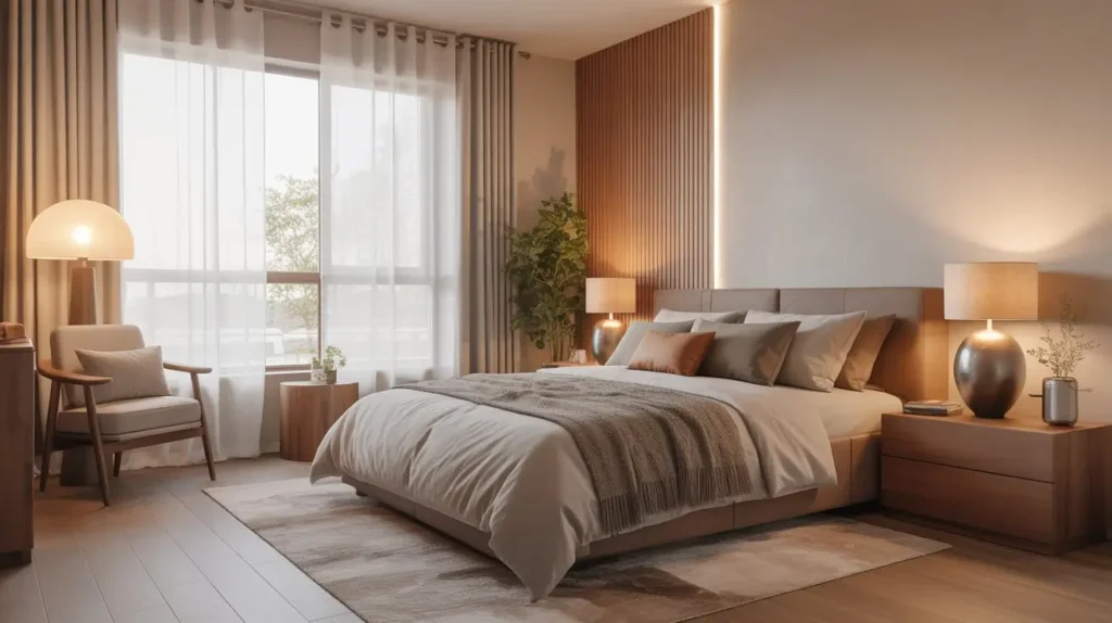 2. Cozy Modern Bedroom with Warm Tones