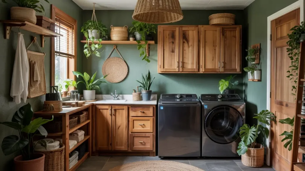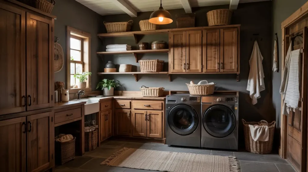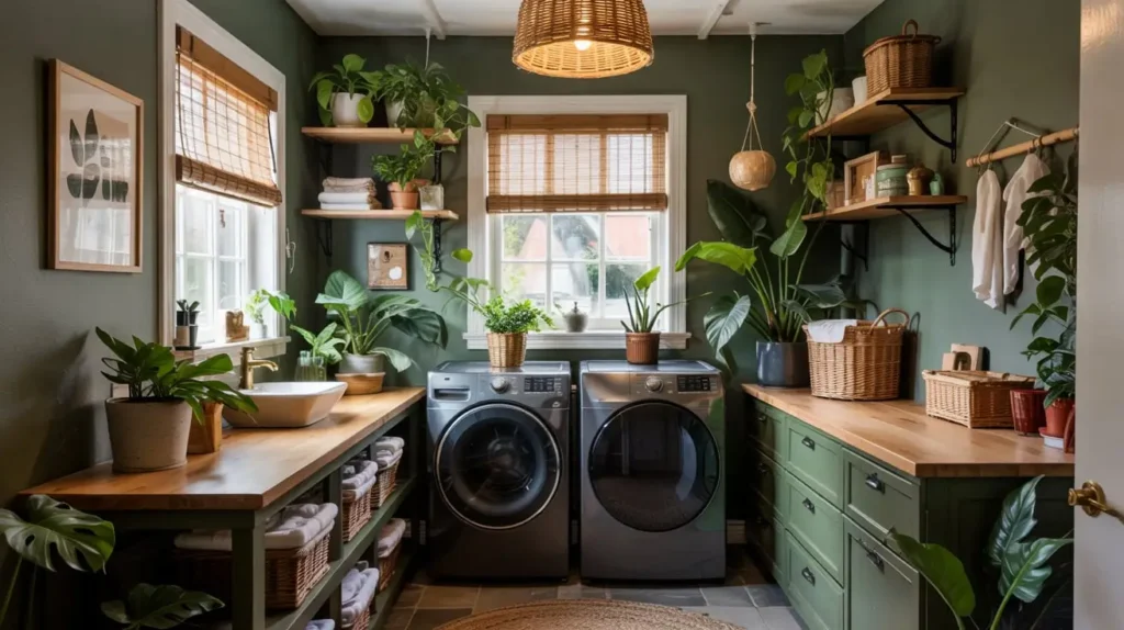 This is a slightly different take on the botanical retreat. While the botanical look can lean a bit glam or tropical, the forest-inspired cozy laundry is all about rustic, cabin-in-the-woods comfort. It’s earthy, warm, and makes you want to curl up with a book (while the dryer hums, of course).
