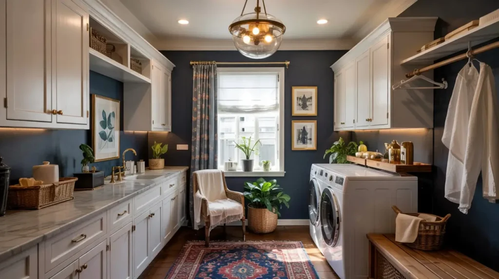 - Unexpected Lighting: Ditch the boring flush mount. Why not a mini crystal chandelier or a pair of sculptural gold sconces? It’s a laundry room, sure, but who makes the rules? 🙂